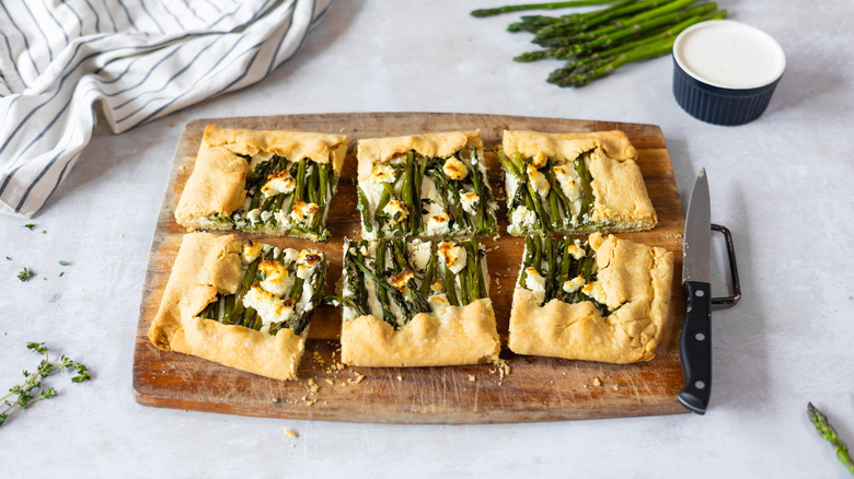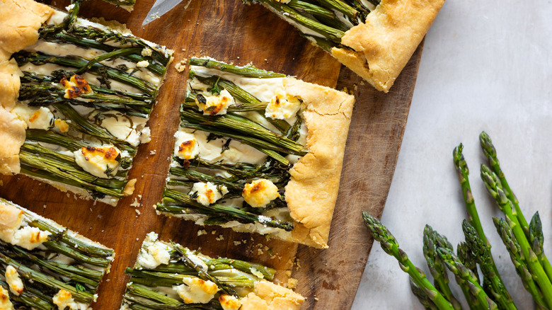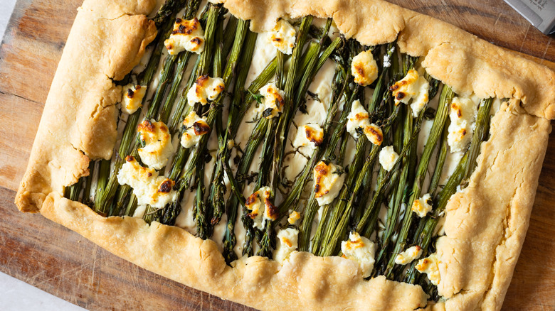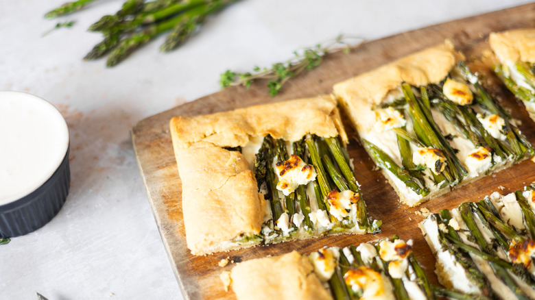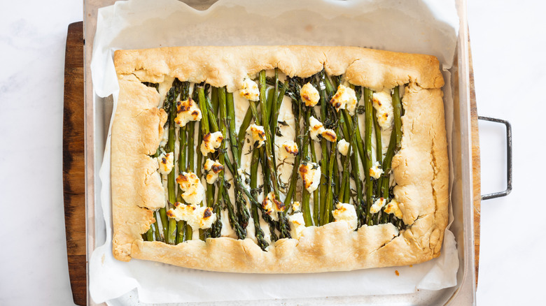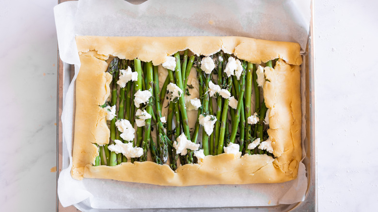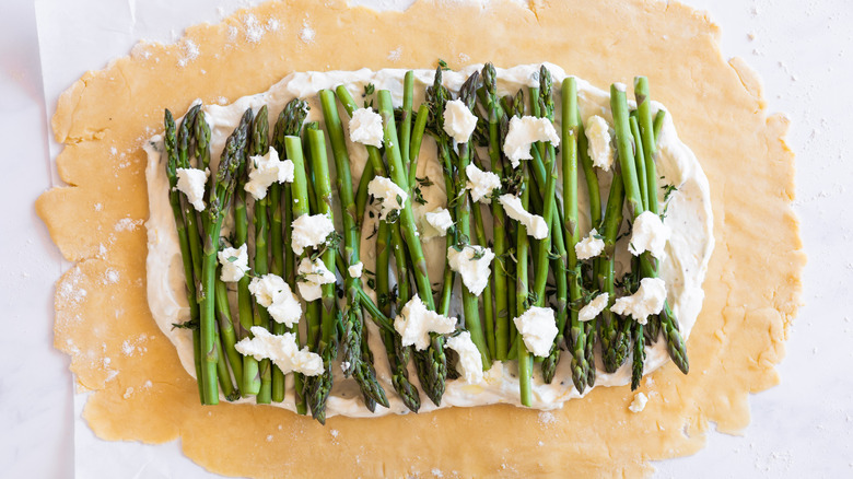 If you only have regular asparagus with thicker stalks, it's best to slice them lengthwise or into thinner pieces to ensure even cooking and easier arranging on top of the galette. "This will allow the asparagus to cook through perfectly, without becoming tough," Douglas assures. "Keep in mind that thicker asparagus may require a few extra minutes in the oven to fully cook and achieve that perfect tender bite." If you're worried about the stalks cooking through, you can always briefly blanch them before adding them to the galette.