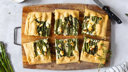 This creamy, lemony asparagus galette elevates even the most relaxed of dining occasions, and it's the perfect dish to whip up prior to guests arriving. Whether it serves as an elegant starter for a dinner soirée or the centerpiece of a brunch gathering with mixed greens and refreshing mimosas, this galette promises satisfaction. To turn it into an easy and sophisticated appetizer, slice it into small pieces and top each serving with a drizzle of balsamic reduction. Or, easily transport this portable galette to a picnic, where the room temperature slices will pair perfectly with crusty bread, cheeses, and fresh fruits.