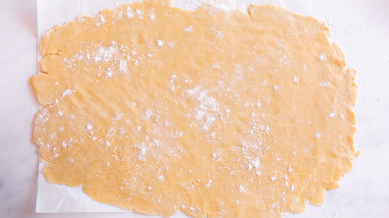 Transfer the prepared sheet of parchment paper to a clean surface. On top of the paper, roll the dough into a rough rectangle measuring ⅛ inch thick.