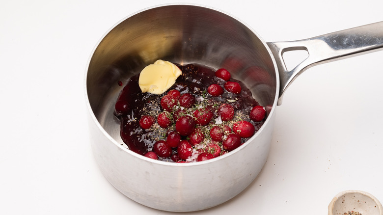 In a small saucepan add the cranberries, cranberry sauce, finely chopped rosemary, butter, and a pinch of salt and pepper.