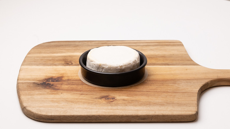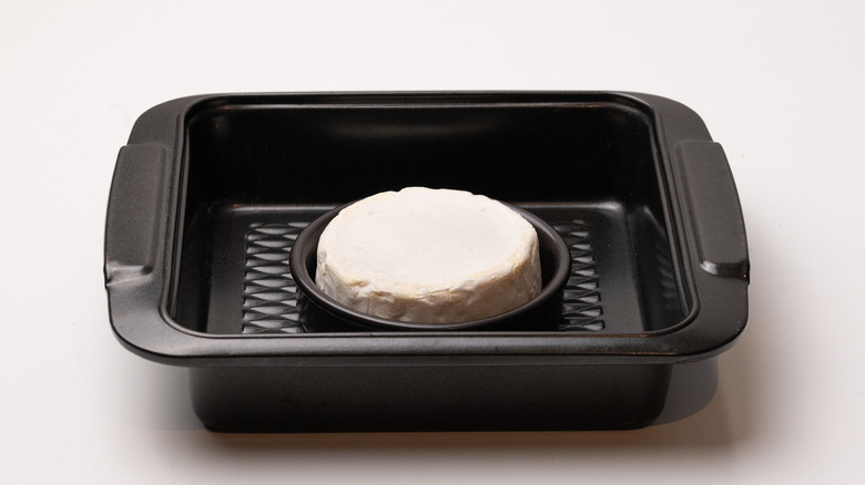 - Place the Brie into a baking tin and bake until gooey, about 15 minutes. When it's done baking, set aside to cool for 5 minutes.