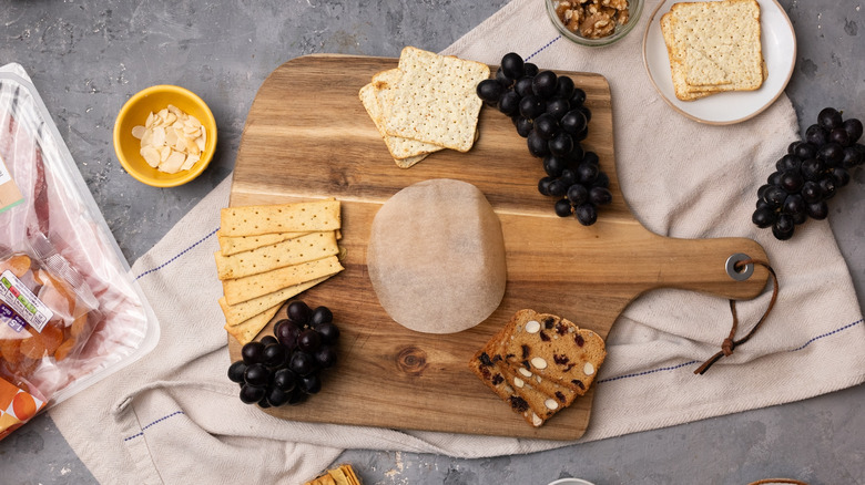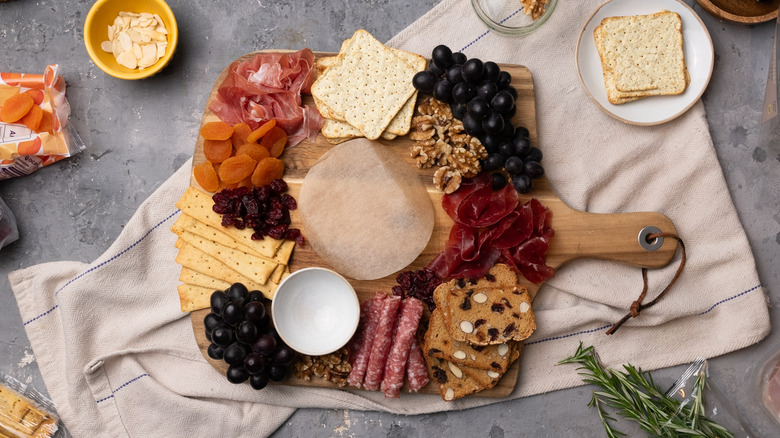 - Meanwhile, arrange the other elements of the board around the space where the Brie will sit. Start with larger ingredients like the crackers and the grapes.