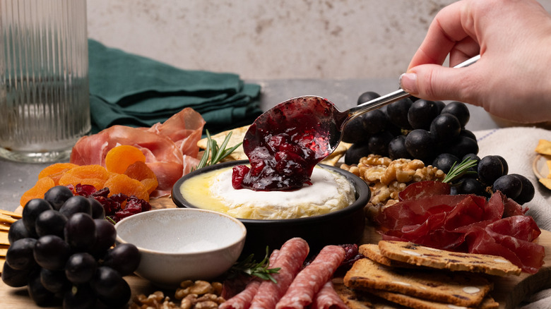 If you are looking for a meal that is easy to assemble and is a feast for both the eyes and the stomach, consider this beautiful cranberry and rosemary baked Brie board from the kitchen of Tasting Table Recipe Developer Jennine Rye. Baked Camembert is a delicious cheesy option often found on restaurant menus, but have you ever enjoyed a baked Brie? Centering around the soft and mild French favorite, this dish maximizes the rich creamy flavor of Brie by baking it in the oven until it becomes a gooey, melted delight. The Brie is topped with a sweet, tart, and sticky sauce made from cranberries and rosemary, and finished off with a sprinkling of nutty almonds. To complete this wonderfully simple yet decadent dish, the Brie is served alongside an assortment of delightful nibbles: salty savory cured meats, crisp fresh grapes, sweet dried cranberries and apricots, and a variety of crackers to scoop up the gooey cheese.