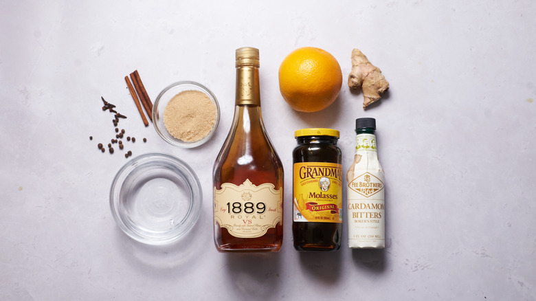 Gather the ingredients for a gingerbread old fashioned cocktail