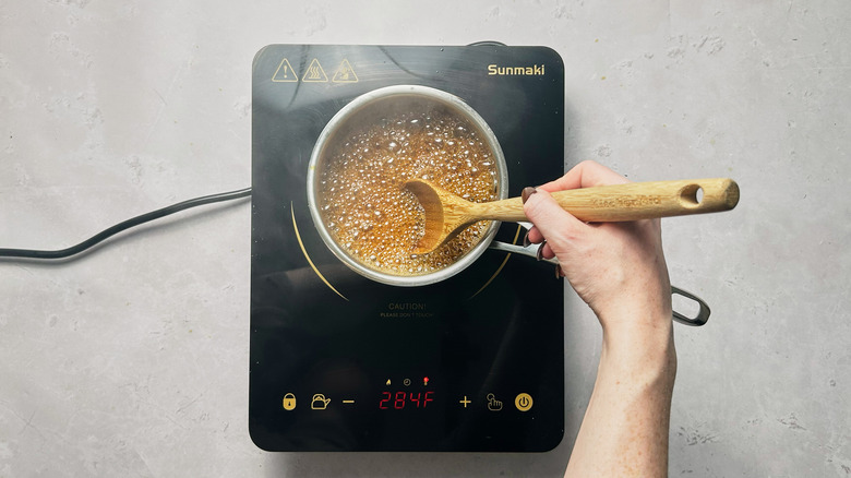 - Combine water, sugar, molasses, ginger, cinnamon, allspice, and cloves in a small saucepan over medium heat.