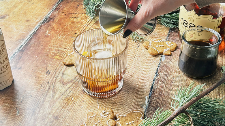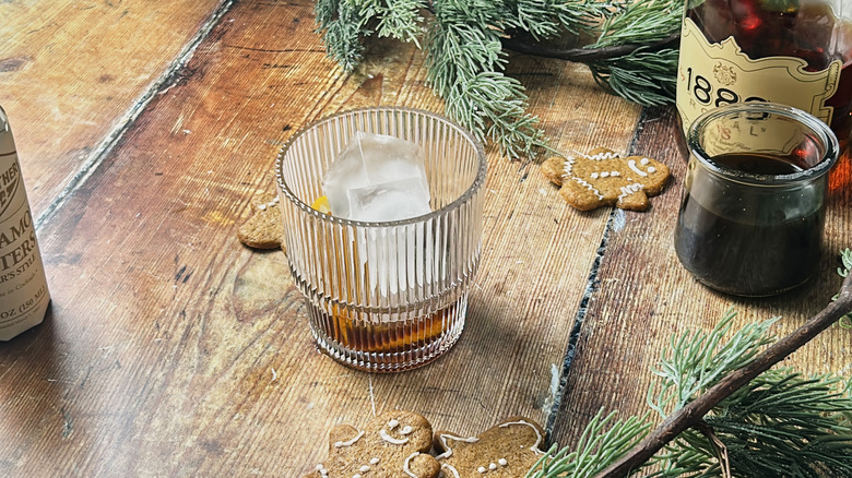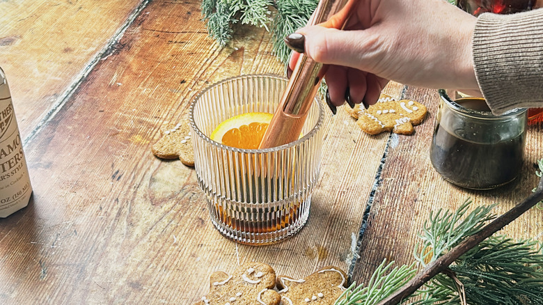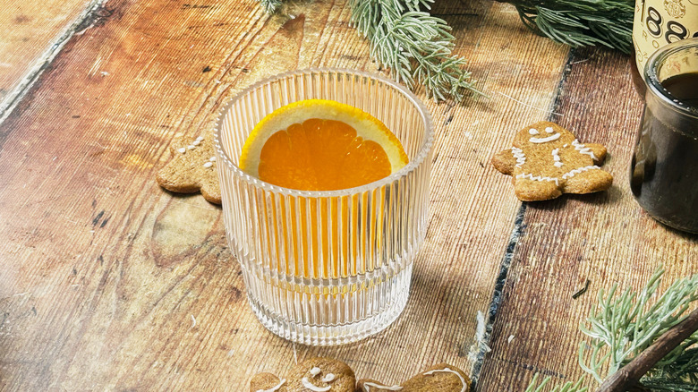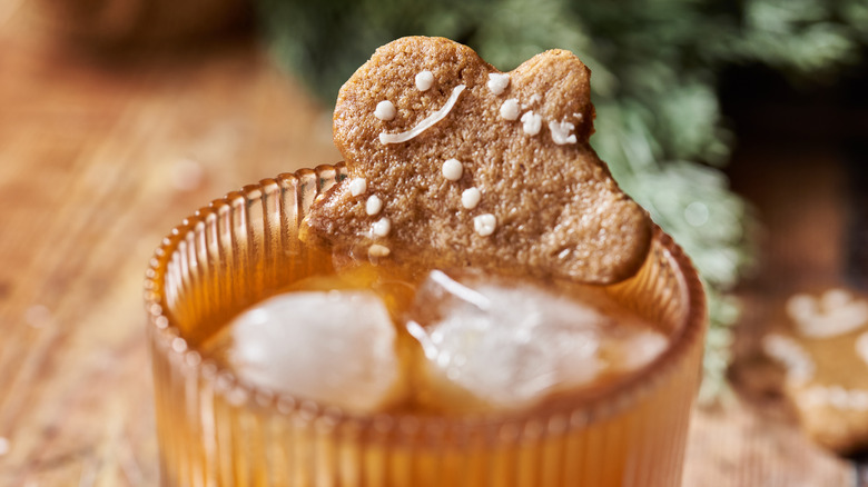 Of course, we recommend garnishing this cocktail with a gingerbread cookie, which adds even more of the sugary, ginger flavor to the drink (it's also super cute). If you're in a rush and can't prepare a batch of cookies — not to mention shaping and icing them — there are plenty of other holiday-friendly garnishing options. Easiest of all is an orange slice, which can be folded into the drink as-is. You can also use dried oranges, which are especially easy if you already made a batch to use for garland. Besides fruit, you can also add a stick of cinnamon or a sprig of rosemary for some warm holiday cheer. If you really want the "cute" factor without the baking, you can also tie the glass with a little bow made of your favorite ribbon so that the drink looks like a tiny little present. If all else fails, check your local grocery store for premade gingerbread cookies — we won't tell.