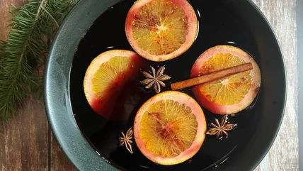 This mulled wine starts with red wine (De Witt chooses to use Cabernet Sauvignon, herself) and adds sugar, water, and rum. For flavoring, you'll need oranges, star anise, cinnamon sticks, and cloves. De Witt does say, though, that "if you're not a fan of cloves, leave them out and add more cinnamon sticks or some cardamom pods."
