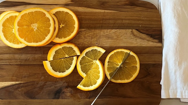 - Slice the oranges into 4 rounds each.