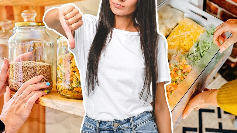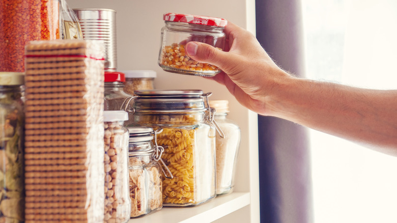 To prevent this apocalyptic scenario, Geoffrey Zakarians suggests using containers of the same shape and size to store as many of your pantry goods as possible. When you have a rectangular box here, a round jar there, and a smaller round container somewhere else, it's not easy to make everything fit. But with matching containers, simply stack everything of similar shape and size together. For example, keep all your spices in identical jars and your flours in square and sealable vats. On top of that, designate a specific area in your pantry for items based on the shape and size of their packaging. This will save you from the prospect of impossible Tetris, where you're trying to squeeze a large, rectangular box of rice in with small and round cans of tuna.