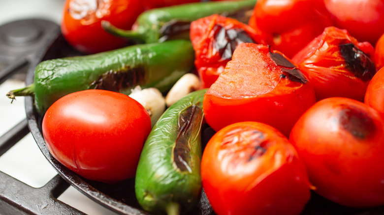 You'll need to turn the pepper every so often with tongs to ensure that all sides char equally. If you have the extra time and ingredients, you can throw a few whole tomatoes and garlic cloves on the griddle with the peppers to create your own charred tomato salsa.