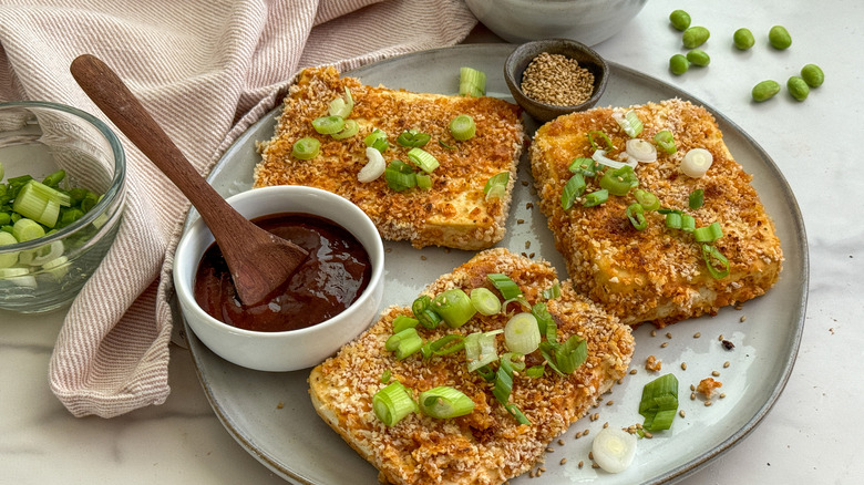 Japanese cuisine offers an array of flavorful and nutrition-packed dishes that are popular worldwide. Ramen and sushi may be the first dishes to come to mind, but another dish that's just as popular is katsu. Katsu refers to a style of cooking in which a cutlet — usually pork or chicken — is breaded and fried. This vegan version uses tofu instead of meat. Since tofu is neutral in taste, it will take on whatever seasonings are used in the recipe. This seasoned tender tofu with a crispy panko breading is perfect for those who love the idea of katsu but want a vegan option.