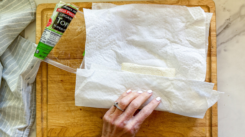 - Remove the tofu from the package and dry it with a paper towel.