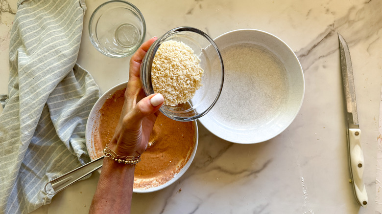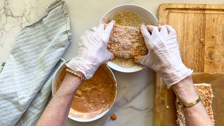 If you're looking for a gluten-free crust, buy gluten-free breadcrumbs, or use toasted quinoa or crushed rice cereal as the breading. You'll also want to use gluten-free flour in the milk mixture. "I like to use chickpea flour, millet flour, or oat flour when I want to use a gluten-free option for breading," Hahn shares.