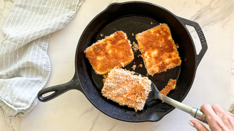 - Place the breaded tofu into the pan and cook for 5 minutes on each side.