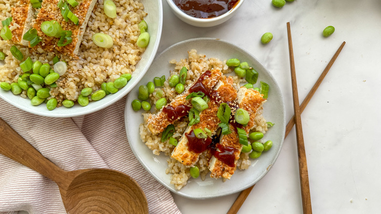 - Serve tofu katsu over rice and garnish with edamame and scallions, if desired.