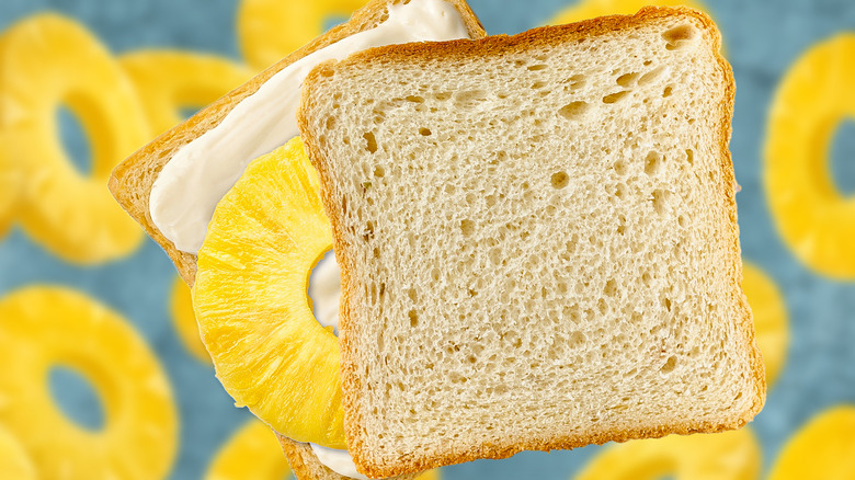 Speaking of mayo, don't be shy when using it on your sandwich. You want a nice, thick layer of mayonnaise to help keep your sandwich from getting too soggy from the pineapple. This may sound counterintuitive but the mayo will block the extra juice from your main ingredient from seeping into your bread too much. After slathering both sides of the bread with a thick, mayo layer you're all set to add your pineapple. Whether you use crushed or sliced rings is up to you, just make sure it's the stuff from the can. After all, canned pineapple is an important part of this sandwich's history.