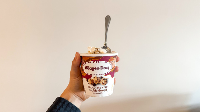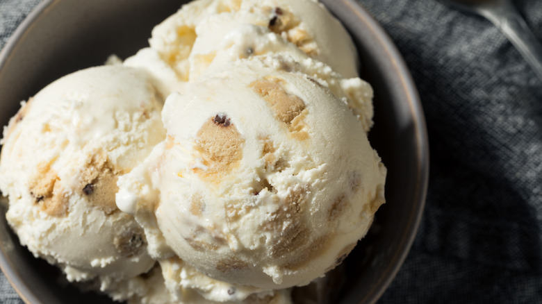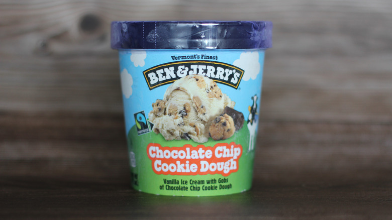Clearly, a lot of air was pumped into this ice cream. The mouthfeel was soft and light, while the cookie pieces intertwined in the ice cream were as ethereal as we remember them being as children. Overall, we found the vanilla flavor of the base to be a bit lacking and felt that its lightness made the ice cream seem cheaper and less high-quality than other brands we sampled. When it comes to the distribution of cookie dough in this ice cream, we found it to be average. The number of chocolate chips in the container was plentiful and not just reserved for the individual balls of dough. Could it be considered a chocolate chip ice cream instead? That's likely — and there always can be more cookie dough chunks, and we expected more from a brand that is at the forefront of cookie dough.