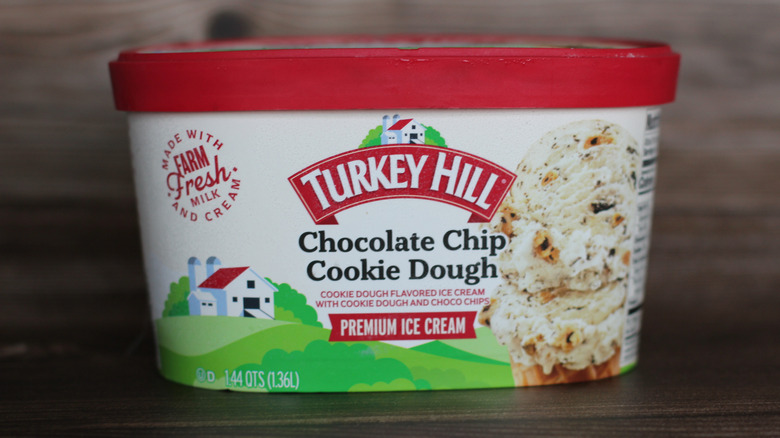 Turkey Hill chocolate chip cookie dough ice cream comes in several sizes, including a 1.44-quart container and a pint-sized container, although our store only offered the larger size option. When we opened the container, we were surprised to see that this ice cream had chocolate flakes — not chips — spread throughout it. If we hadn't checked the label twice, you would have fooled us for cookies and cream ice cream, instead. A few pieces of cookie dough were nestled in the top of the ice cream and had an average flavor, with lingering notes of brown sugar and browned butter. It was good when we could find them, but these pieces were few and far between in the ice cream.