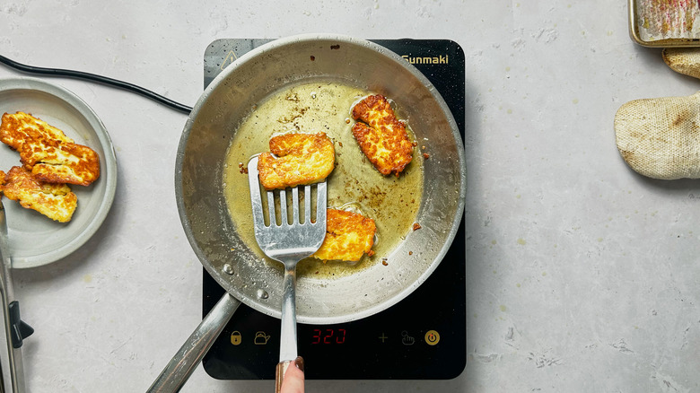 Seared halloumi develops a crisp browned exterior that encases the salty, creamy cheese within. McGlinn fries the cheese in olive oil at a medium heat, searing each side for two minutes. The cheese will release its liquid and take on a golden brown color, indicating that it's done. Halloumi has a slight tang that pairs beautifully with earthy beets, as well as any ingredient that makes up a winter salad.
