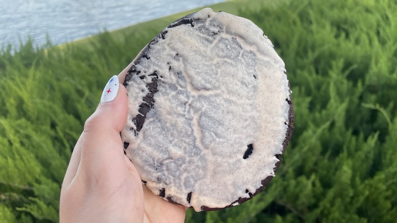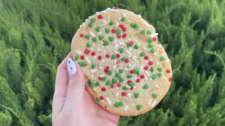 If you're traveling with little ones — or parties who prefer their meals on the milder side — the jingle sugar cookie is a safe bet on your Cookie Stroll. For our palettes, it was a little too tame, but that's not to suggest that it's unpleasant whatsoever. The jingle sugar cookie is just a straightforward snack, and if you've ever eaten a giant sugar cookie before, you'll likely recognize its familiar flavor profile. It's chewy, bendy, and slightly salty, and the neatly perched M&M's provide some lovely, chocolaty crunch along its surface. That said, you really can't go wrong with a cookie draped in bits of candy, but it wasn't quite as notable as the other options on our roster. Our advice is to pick a jingle sugar cookie up if you please — but don't worry for a moment if you happen to overlook it.