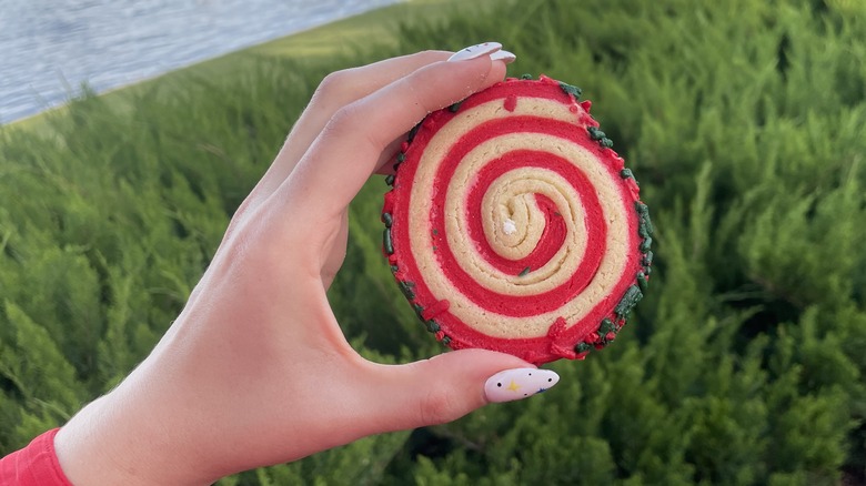 If we were to award points based on looks alone, the Peppermint Pinwheel Cookie would surely earn a handsome score. The merry menu item features brilliant swirls of red and white cookie dough, edged with a festive array of red and green sprinkles. If you're after an Insta-worthy option from Epcot's Cookie Stroll, the Peppermint Pinwheel Cookie is poised to attract plenty of likes from followers.