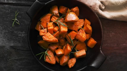As the perfect robust side, milk-braised sweet potatoes taste incredible with other rich recipes. Pair them with flavorful dishes like balsamic-glazed pork tenderloin and roasted apples. Savory pork under a honeyed glaze of balsamic vinegar and brown sugar makes a good match to the milk-laden sweet potatoes. With roasted apples providing a touch of tartness, round out your plate with another veggie, such as garlic lemon Brussels sprouts.