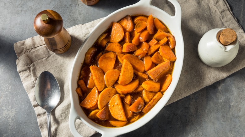 While braising isn't the most popular method for cooking sweet potatoes, the technique makes them more delicate, softening them in a way that allows the potatoes to melt in your mouth. They will still soften when being braised in broth or wine — a more familiar choice for braising liquid — but using milk will make your potatoes especially tender to the touch because the fats from the dairy will keep too much of the starch in your potatoes from sticking together. Plus, the sugars in milk are a great way to add more flavor.