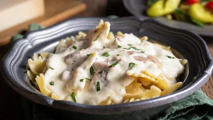 For a decadent vegetarian-friendly "chicken" Alfredo, swap the chicken for a plant-based alternative made from soy protein concentrate, seasoned with smoked paprika, garlic powder, and rosemary. Daring Original Plant Chicken is a killer option and Miyoko's makes vegan-friendly European-style butter made from cultured cashew milk.