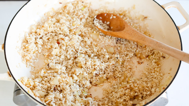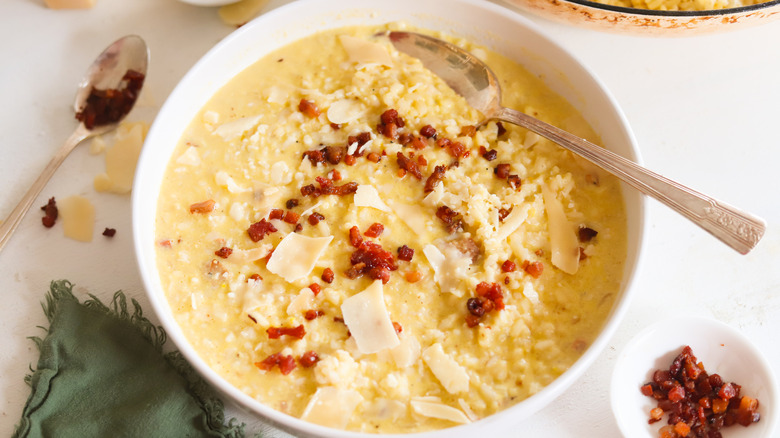 The Roman dish traditionally calls for spaghetti and has expanded to other fine, long strands like linguine or bucatini that are regarded as the best type of pasta for carbonara sauce. Sure, carbonara clings to these delicate noodles like a dream, but its rich texture adorns other grains beautifully, particularly Arborio rice. Recipe developer Leah Maroney opts for the rice in her carbonara-style risotto dish, as the grain lends the silky sauce a "cozy and comforting" feel. The carbonara tastes no different in this recipe. However, the preparation is slightly different.