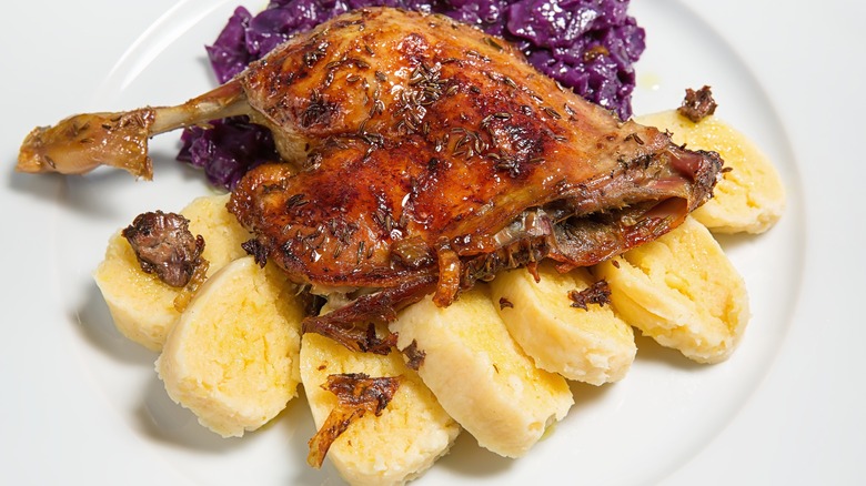The dough is made by boiling potatoes with the skin left on. After they cool completely (preferably overnight), they're peeled and shredded. Next, the potatoes are mixed with eggs, flour, farina, starch, and salt. When it comes to shaping the dough, chefs aim to create a roll with a diameter of two to three inches. Other options include forming the dough into small logs known as "špalíčky" or small sausage-shaped rolls called "šišky." Regardless of the shape, the rolls are dropped into simmering water for approximately 20 minutes. Once cooked, they're sliced into rounds and served. You'll find bramborove knedliky paired with main dishes such as roast duck or pork, as well as sides like creamed spinach, braised cabbage, and gravy.