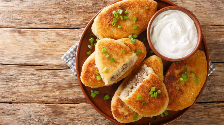 To prepare them, tender potatoes are mashed with egg and flour to form a dough. The dough is then rolled out into small disks. From there, they're filled with minced meat or sautéed vegetables. Next, the disks are folded into cutlets and coated with bread crumbs or cornmeal, before taking a dip in the frying pan until they turn golden-brown. Like any Eastern European potato dish worth its salt, kartofelnye zrazy is best enjoyed with a generous dollop of sour cream and a sprinkling of fresh dill and chives.