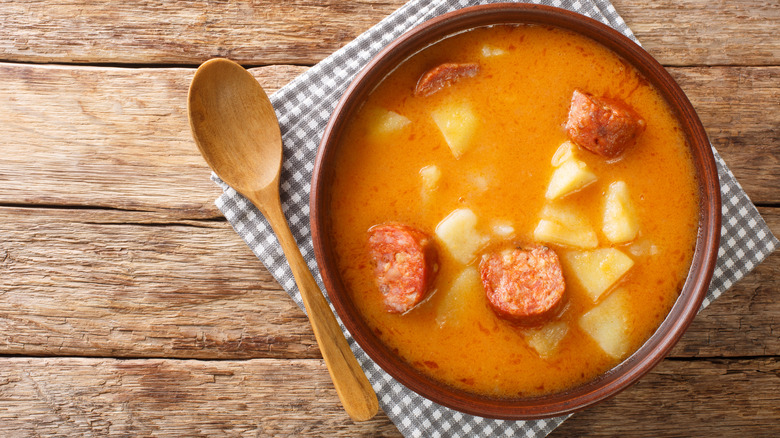Given goulash's popularity both at home and abroad, it's easy to forget that Hungarian cuisine offers plenty more delectable soups. In particular, there's krumplileves, a potato soup featuring a broth infused with roux, onions, bay leaves, and paprika. Many Hungarian cooks opt to enhance the soup's heartiness by adding sausage, but adding meat is optional.