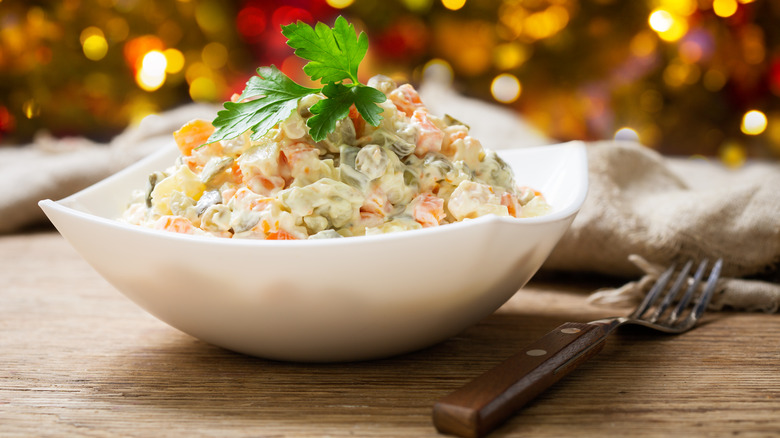 Otherwise known as Russian potato salad, this simple dish is a staple at New Year's Eve celebrations in Russia. The salad owes its name to Lucien Olivier, a Belgian chef who ran Hermitage, a popular restaurant in Moscow in the 1860s. Olivier's original recipe featured potatoes along with luxurious ingredients such as caviar, smoked duck, and crayfish. The dish transformed into the more modest version we are familiar with today during the formation of the Soviet Union.