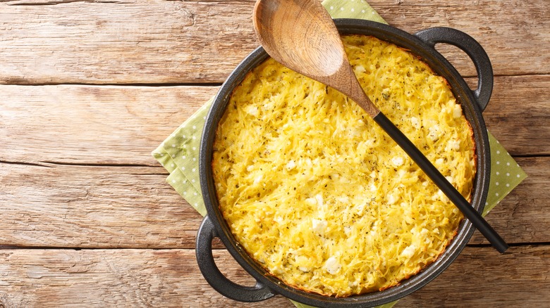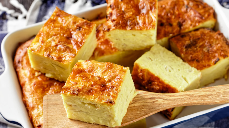 This dish, which originally hails from Southern Germany and has deep roots in the Ashkenazi Jewish cuisine, is made by combining grated potatoes and onions with eggs, starch, salt, and pepper. The starch can be just about anything that's on hand — cornstarch, flour, and matzo meal all work well. Once blended, the ingredients are poured into a coated baking dish or a cast-iron skillet. While traditionally coated with schmaltz, or rendered chicken fat, it's possible to use oil for the sake of convenience. After baking, the potato kugel develops a crispy crust and a tender interior. It can be served with meat for an easy dinner option or alongside eggs to elevate a brunch experience.