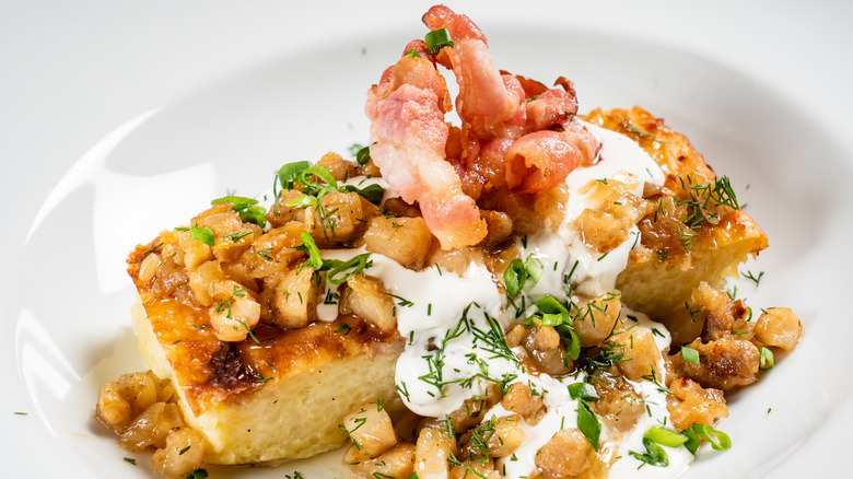Potato babka, a potato casserole popular in Belarus and northeastern Poland (where it's known as babka ziemniaczana), is everything we love about potato casseroles and more. This culinary masterpiece is prepared by combining grated potatoes and onions with salt pork or bacon, egg, flour, sour cream, salt, and pepper before baking. The secret to a perfectly crispy potato babka is to cook the casserole once, then brush the top with leftover meat grease or oil before popping it back into the oven for an extra 10 minutes. To complete the experience, babka is often served with a dollop of sour cream, freshly chopped scallions, and a sprinkle of crunchy bacon bits.