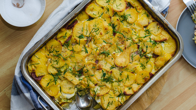 From dumplings and pancakes to quiches and soups, potatoes can be incorporated into dishes of all shapes and sizes. While we love starch-based meals in all their forms, we'd be lying if we didn't mention our love for potato casseroles. Every country has its version, but in general, they include layers of sliced or diced potatoes interspersed with a creamy sauce, cheese, and herbs. The ingredients list is worth fawning over itself, but the magic truly unfolds during preparation. As the casserole bakes, it develops a tantalizingly crispy crust that perfectly encapsulates the rich, bubbly filling.