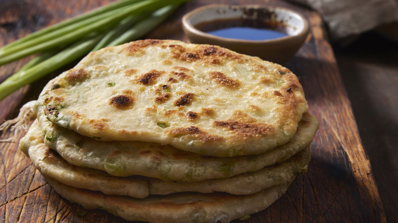 A longstanding Chinese tradition, scallion pancakes are griddle-fried flatbread rounds dotted with fresh scallions that create the perfect balance between crispy and chewy. While this popular street food snack and restaurant appetizer comprises a mere handful of ingredients, it's a hard recipe to execute; unlike pancakes where a liquid batter bakes into dough on the griddle, scallion pancakes require you to make the pancake dough, roll it out, and shape it into the desired round before frying it.