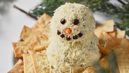 Ranch-inspired seasonings like dill, chives, and garlic flavor this cheddary snowman cheese ball, which is almost too cute and festive to eat.