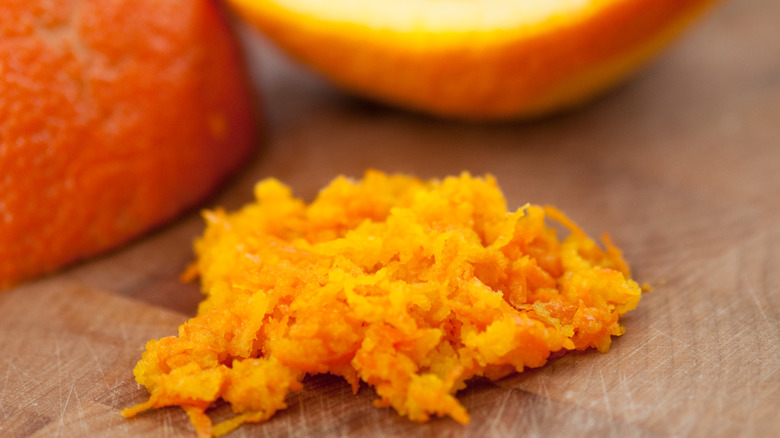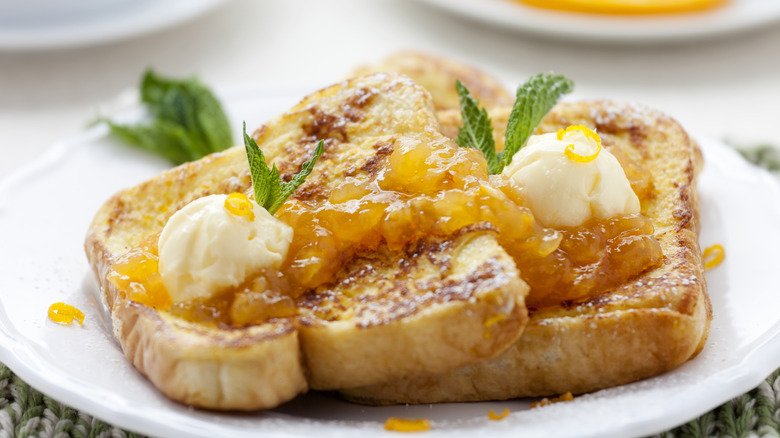 To create Martha Stewart's zesty orange French toast, simply add the orange zest, orange juice, and a splash of orange liqueur to the egg mixture. Once the orange-infused egg mixture is ready, continue to make the French toast as you normally would. Of course, this version of the dish can be served with a dusting of powdered sugar or a swirl of maple syrup.