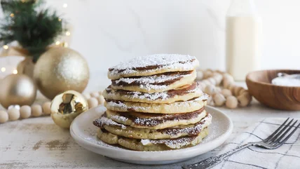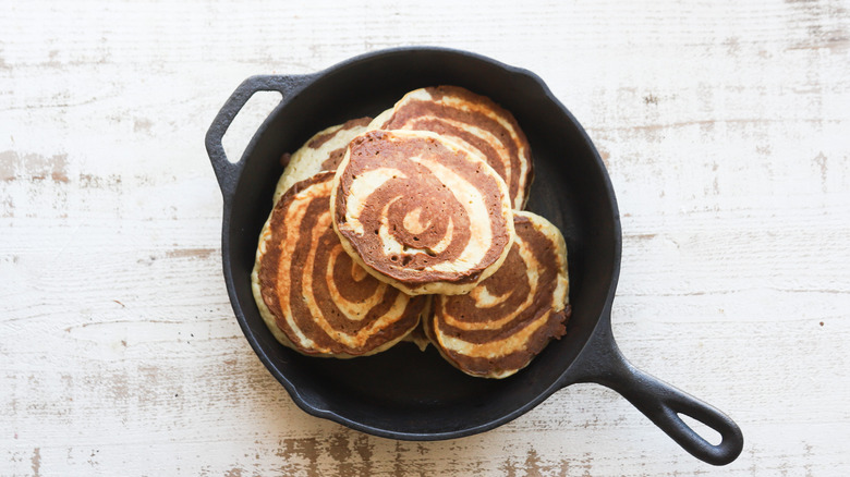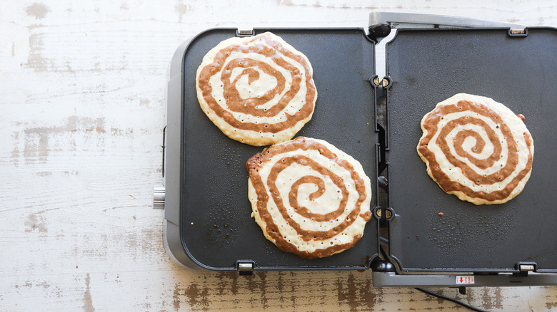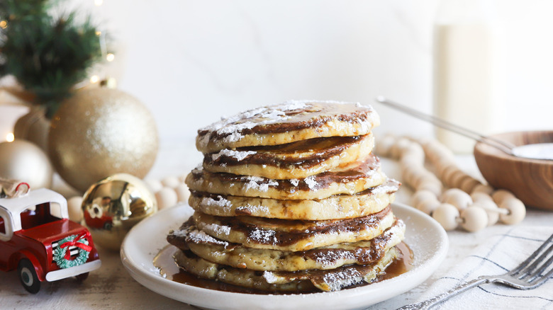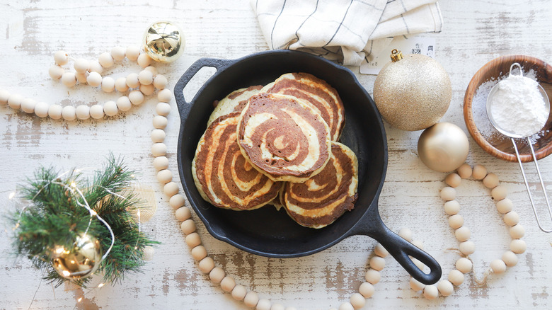 Picture this: It's Christmas morning and you wake up hungry and ready to eat something festive, delicious, and special. Brunch restaurants are closed and you're not exactly a baking pro. Luckily, this cinnamon bun Christmas pancake recipe is oh-so-tasty and far easier than whipping up a batch of (also delicious) yeasted cinnamon rolls. By separating a bit of the batter and adding in molasses and cinnamon, you can give these pancakes a boost of holiday spirit without too much extra effort. The cinnamon pancake batter is swirled into the plain batter while the pancakes cook on the griddle. Top it all off with some powdered sugar and maple syrup to complete this magical Christmas breakfast.