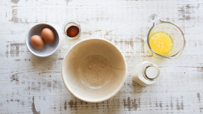 - Add the milk, butter, eggs, and vanilla to a medium-sized bowl.