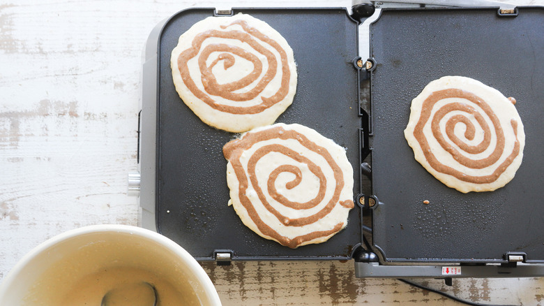 - Cut the tip off the pastry bag and pipe a swirl of cinnamon batter onto each pancake.