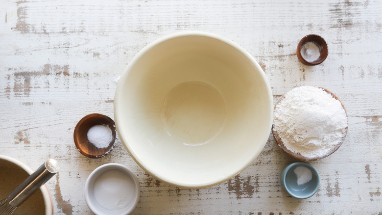 - Add the flour, sugar, salt, baking powder and baking soda to a large bowl.