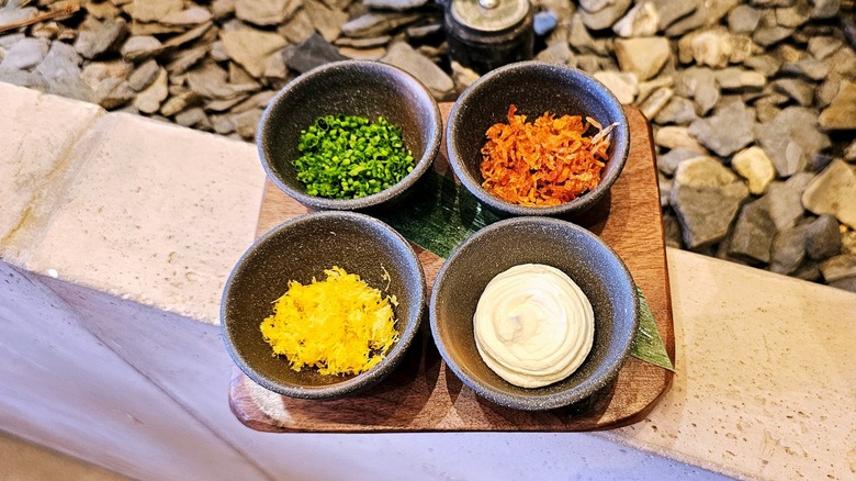 Those toppings consist of crème fraîche, lemon zest, and chives, all of which can be found atop the caviar sushi. Tyson Cole tells us that the crème fraîche provides the fat, while the lemon zest brings the acid to contrast with the saltiness of the caviar. Then, Hammond added one more ingredient that doesn't typically come with Uchi's caviar set: crispy shallot. Hammond says the shallot was added for textural reasons, but Hammond and Cole didn't pick these four ingredients just because they were part of Uchi's caviar set. They picked them because they're traditional.