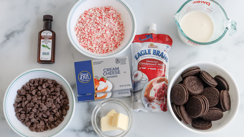 For this recipe, you'll need Oreo cookies, melted butter, cream cheese at room temperature, sweetened condensed milk, peppermint extract, semisweet chocolate chips, heavy cream, and crushed candy canes.
