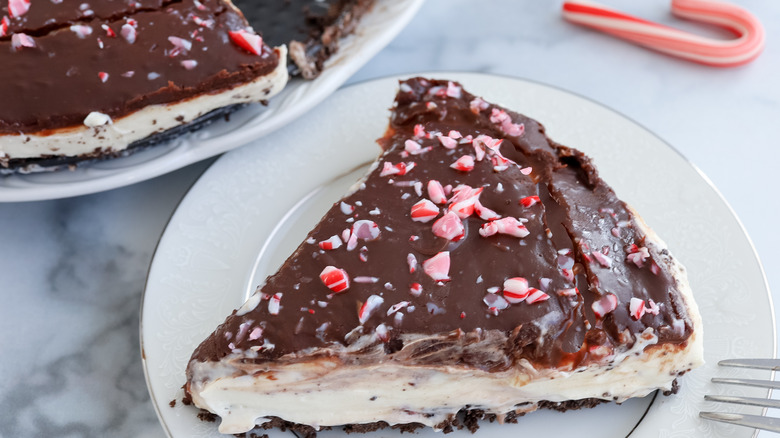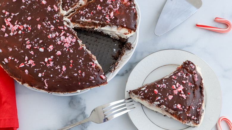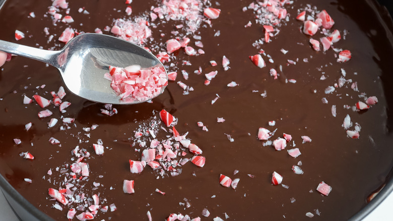 As for the velvety rich chocolate topping made with heavy cream and chocolate chips, she notes, "you also want to microwave until there are no more chocolate bits and it's silky smooth before pouring it." This will prevent lumps from setting on the surface of the cake. Thankfully, the crushed candy cane garnish can cover up a few imperfections.