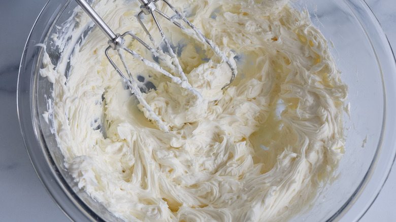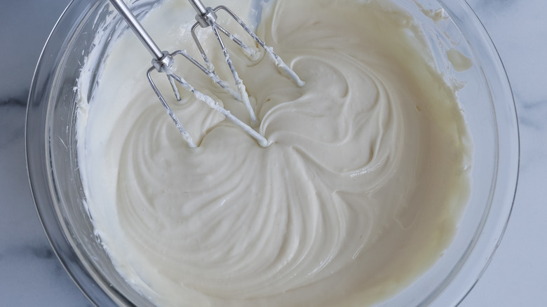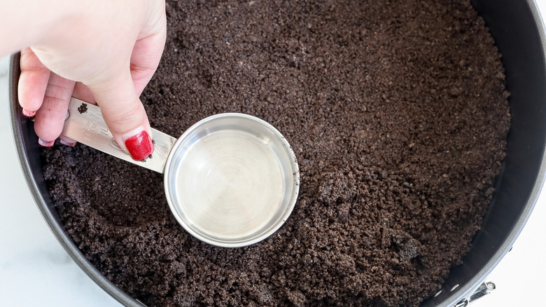 To start, Morone explains, "The Oreos should be crushed into fine crumbs before adding the butter, then when you press it into the pan it should form an even layer." Along with the butter, the creamy filling of the cookies helps bind the crust together. Next, she instructs, "You want to beat the cream cheese until there are no lumps left before adding the sweetened condensed milk," and emphasizes using room temperature cream cheese: "If your cream cheese is too cold you can microwave it in 10 second increments until it softens."