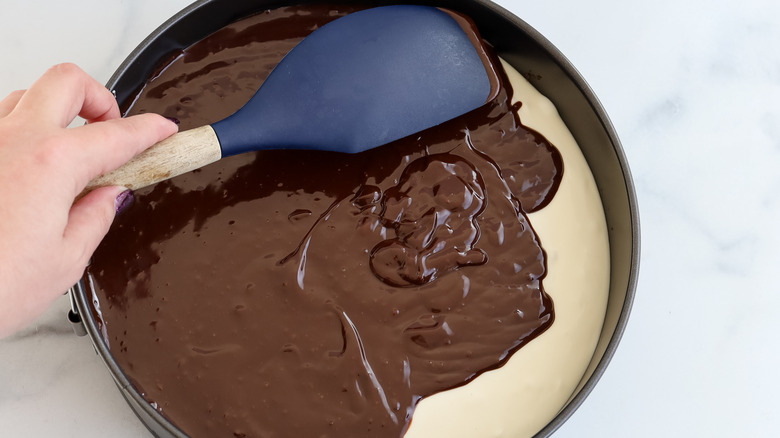 Pour the melted chocolate over the filling in the pan and spread it out evenly.