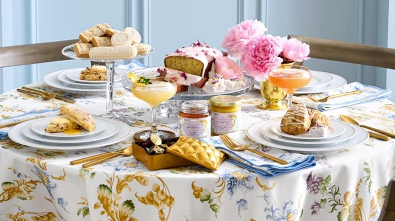 The exclusive Bridgerton x Williams-Sonoma collection seems to have every aspect of a tea party covered, from tableware to pre-made baked British sweets. There's jarred Bridgerton passionfruit curd, Bridgerton lavender honey, and a trio of beverage mixes: Blood Orange Blossom Fizz, Honey Ginger Tonic, and Elderflower Lemonade. To cut down on party prep, there are baking mixes for Orange Cardamom Shortbread, Strawberry Scones, and Vanilla Earl Grey Quick Bread. In the tableware department, there's a round cotton twill tablecloth with a soft blue floral pattern and (of course) matching cloth dinner napkins, cocktail napkins, and a table runner, sold separately.