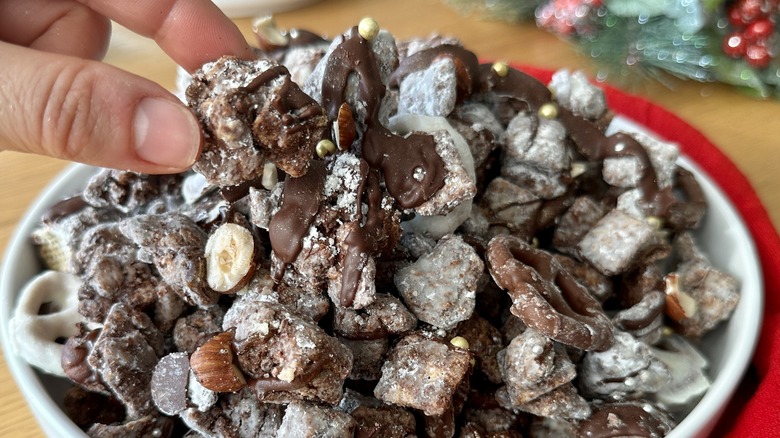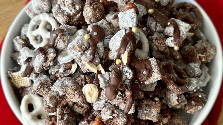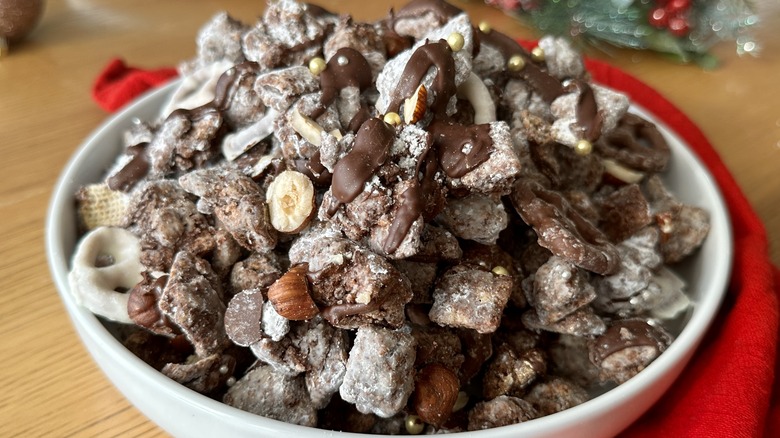 Whether you grew up calling this craveable snack muddy buddies, puppy chow, reindeer chow, or monkey munch, you know it's just about the most perfect holiday treat ever invented. Recipe developer Katie Rosenhouse brings us this recipe for a sophisticated twist on classic muddy buddies — a chocolate-coated Chex Mix concoction that's crisp, chocolaty, and just oh-so-snackable. "Muddy buddies are outrageously dangerous," Rosenhouse tells us. "As a pastry chef, I'm around desserts pretty often, and let me tell you: muddy buddies are the one sweet snack I'm completely unable to resist."
